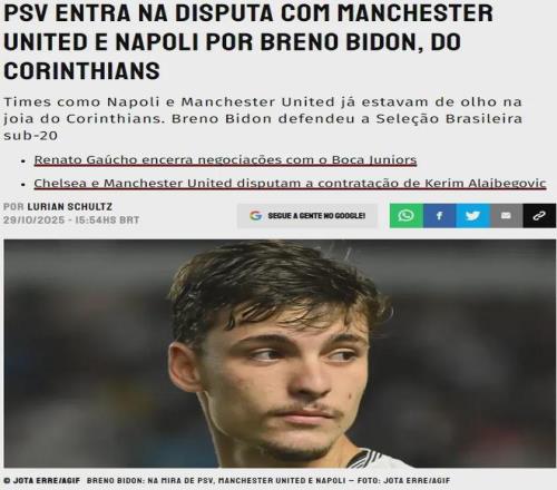 Somos Fanaticos消息,曼联有意收购巴西中场布雷诺-比顿(Breno Bidon),这名20岁的新星还吸引了埃因霍温和那不勒斯的兴趣。