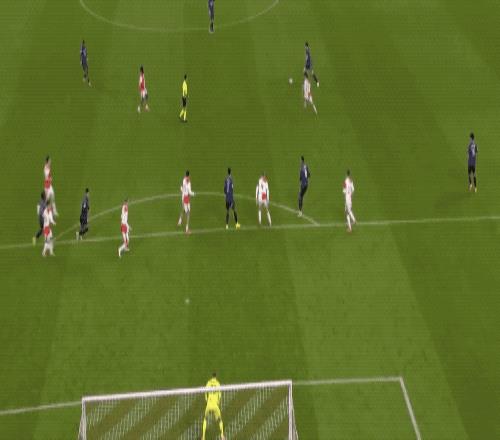 第23分钟,接到赖斯的直塞,萨卡高速插上,抵住防守球员小角度射门,门将稳稳将球挡出。