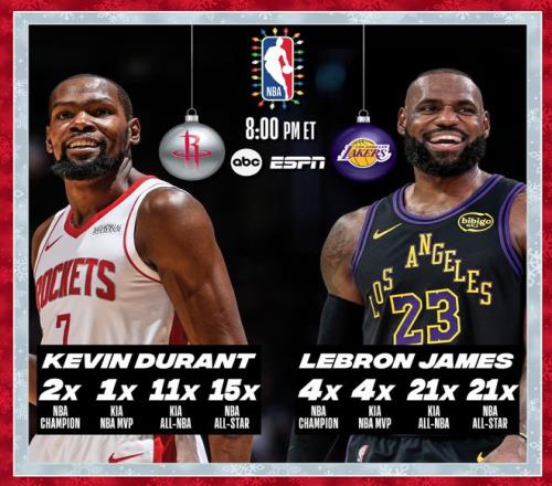 北京时间12月25日,NBA官方预热了年终大战,杜兰特与勒布朗这两位传奇巨星将第五次在年终大战中交手,前五次交手詹姆斯4胜1负占优。