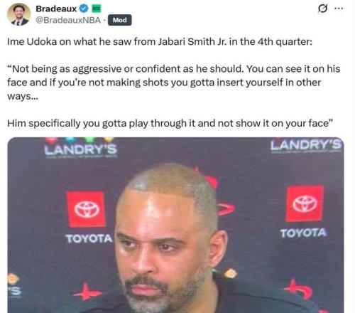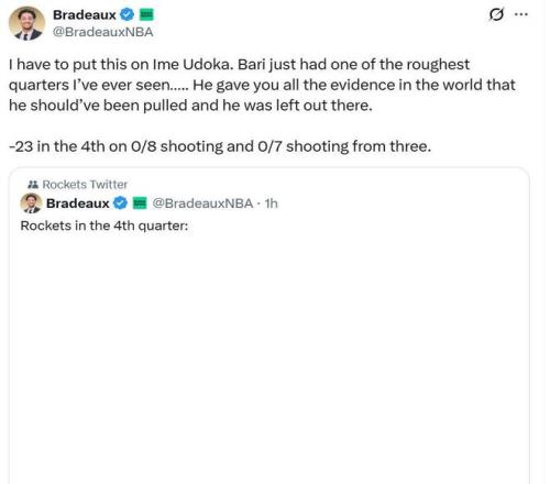 赛后连火箭媒体人Bradeaux都感到不解:“我这一次不得不把比赛失利的责任归咎于乌度卡,小贾打出了生涯最挣扎的一节比赛,他已经用各种方式证明他需要被换下场,结果乌度卡依旧将其留在场上。”