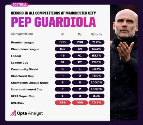 瓜迪奥拉可以称为曼城队史最成功的教练,他在所有赛事中的胜场数远超俱乐部以往的任何一位教练。此次胜利意味着他执教曼城的胜场数比其他任何教练都至少多出180场,胜场数排在他身后的是莱斯-麦克道尔(1950-1963执教曼城)。