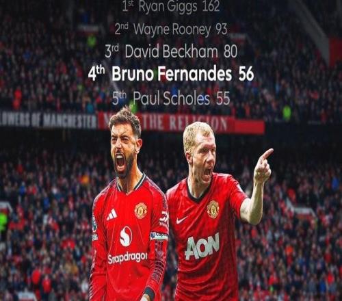 英超第13轮,曼联客场2-1逆转水晶宫,布鲁诺-费尔南德斯完成两次助攻,他的英超助攻数达到56次。布鲁诺-费尔南德斯代表曼联在英超助攻56次,反超斯科尔斯,升至曼联队史英超助攻榜单