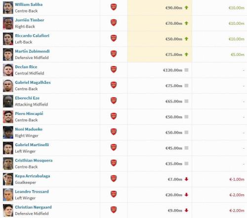 北京时间12月9日,德转公布了最新一期的英超球员身价榜,阿森纳这边,萨利巴和廷贝尔身价上涨1000万,萨卡下跌1000
